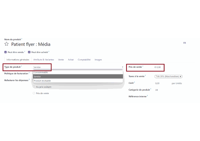 Créez un produit de type Service et fixez le Prix de vente à 0.